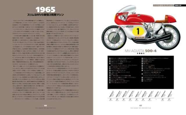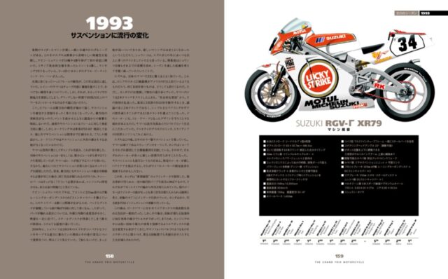 著者はCycle World誌のテクニカル・エディターであるケヴィン・キャメロン。 各年のチャンピオンマシンの詳細なデータやその背景も語られ、さらにレーシングマシンにおける「デザインの時代性」についても述べている。 年度別に独立した構成であるが、世界選手権レースで使用されたエンジン、シャシー、ブレーキ、タイヤの進化に関するひと続きの物語ともいえる。 激化する競争や急速に変遷する技術、そして世界最高峰のライダーからのフィードバック。 この継続的な進化のプロセスこそがデザインへと寄与し、現代のMotoGPバイクの形を導くに至ったのである。そしてそれは現在のスポーツバイクの生産においても言えるだろう。